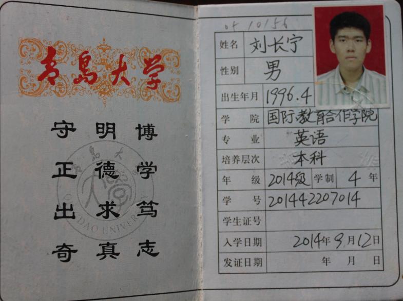 捡到 刘长宁 的学生证